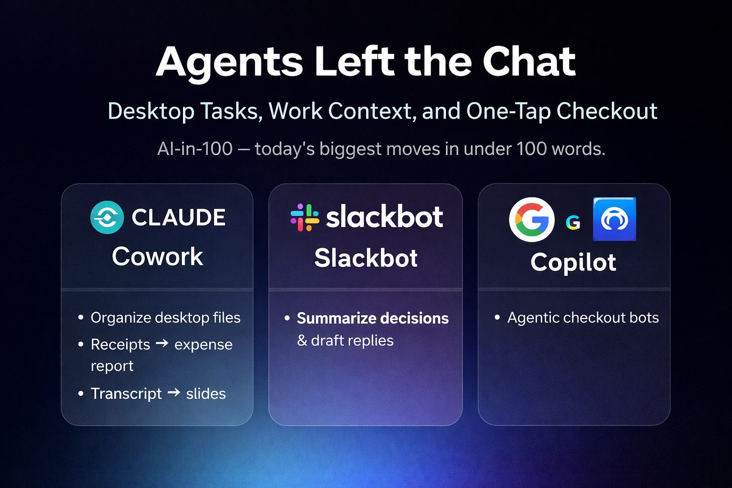 Agents moved out of chat and into real workflows. Anthropic’s Claude Cowork adds “Tasks” to Claude Desktop: describe the outcome, and Claude runs multi-step work with direct local file access, coordinates sub-agents, and exports finished spreadsheets, slide decks, and organized folders back to your computer. Slack rebuilt Slackbot into a context-aware personal agent that uses the messages, files, channels, and tools you already have access to to generate briefings, surface decisions, and draft replies in your voice. Commerce followed: Google’s open-source Universal Commerce Protocol standardizes agentic checkout, while Microsoft’s Copilot Checkout keeps “conversation to conversion” inside Copilot.